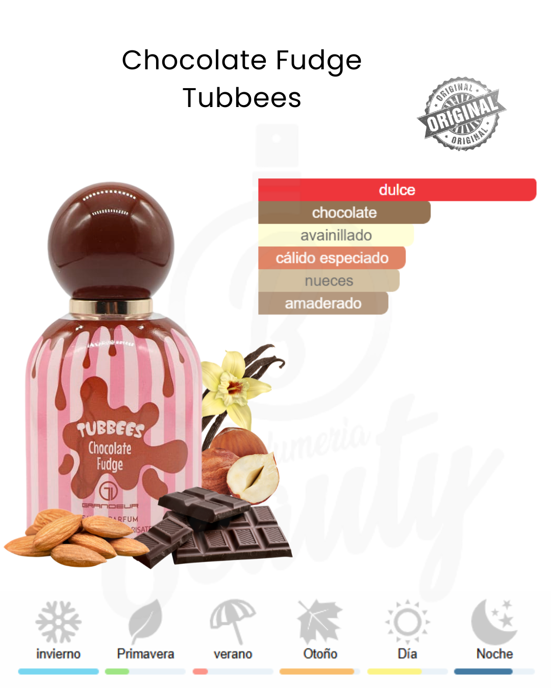 Notas de Fondo: Praliné, absoluto de vainilla, Amberwood y sándalo.