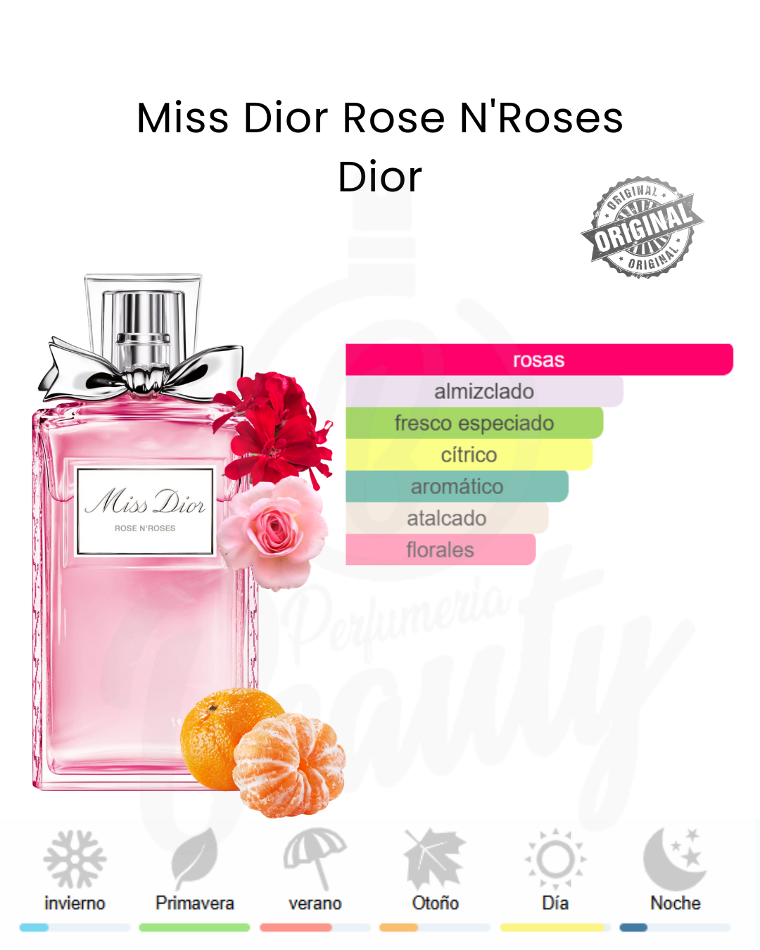Miss Dior Rose N'Roses de Dior es una fragancia de la familia olfativa Floral para Mujeres. Miss Dior Rose N'Roses se lanzó en 2020. La Nariz detrás de esta fragrancia es François Demachy. Las Notas de Salida son geranio, bergamota y mandarina italiana; las Notas de Corazón son rosa de Grasse y rosa de Damasco; la Nota de Fondo es almizcle blanco.